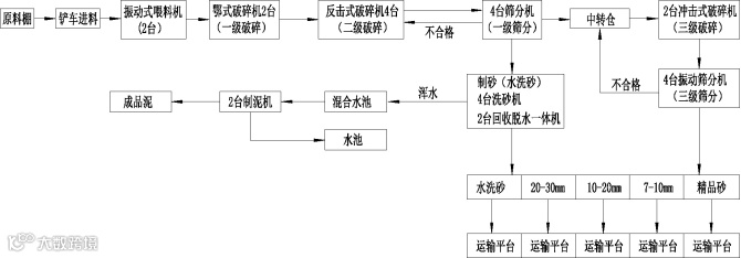 一期的原料进入原料棚后可以直接倒入漏斗形状的振动给料机2台(型号规格WSHT1550),不能直接倒入的先卸载原料棚内再由倒运车倒入给料机,石料由振动给料机均匀地送到颚式破碎机进行粗破,粗破后的物料由传送带输送到反击式破碎进行进下一步破碎,细碎后的物料被输送到振动筛分机进行筛分,达到成品粒度要求的物料被送入洗砂机清洗,清洗后由成品输送带输入成品仓;未达到成品粒度要求的物料从振动筛返输送至反击式破碎机重新加工,形成闭路多次循环,再次回到筛分机后部分进入中转仓,由中转仓过渡到下一个破碎机进行再一次破碎,三次破碎后进入三次筛分,三次筛分合格的进入成品仓库,不合格的返回中转仓,形成闭路多层循环,成品粒度可按用户的需求进行组合和分级,由成品仓库运输到装机平台进行装车,厂区的辅助生产用房为机修大棚、办公楼、倒班休息室,生产设备工艺流程如下: