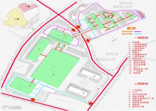 一期功能布局:一期总用地为68284平方米,总建筑面积为48551平方米,主要为原料加工(原来来自于周边来料),一期的规划布局利用现状条件结合生产工艺流程进行总体布局两条生产线(时产1500吨),由于周边道路禁止开口原因,进出口均接入健康路,健康路的711.000高程点作为主要入口,车辆经过入口进入项目内来料车辆直接达到原料棚,卸车后从原料棚出来经过第一次汽车冲洗(全车残留的砂石进行冲洗),最后经过出口处的第二次冲洗达标后(主要是对车轮)进入市政道路,砂石成品车辆经过入口进入场地后再进入各自需要的型号成品砂石装机平台(装机平台处有地磅进行称重),装车完成后再经过出口处冲洗轮胎(出口处设置有两个地磅和两个洗车池及洗车后的废水沉淀池)和拿票据进入市政道路,出口处设置两个出口,其中一个出口分为成品车出口和办公区车行入口及人行道入口,办公车辆出入口与成品区车辆出口之间采用绿化带隔离。