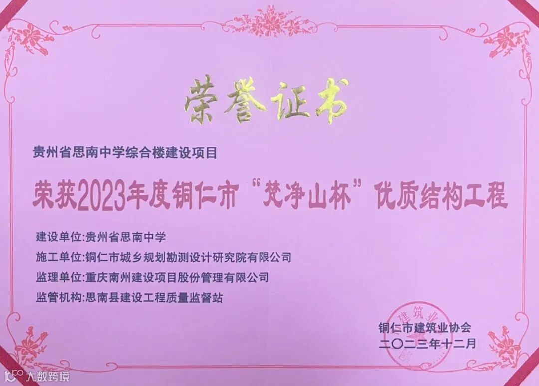近日,铜仁市建筑业协会发布了2023年度铜仁市“梵净山”优质结构工程和铜仁市建筑工程安全文明样板工地评选结果的通报。我司承建的思南中学综合楼建设项目获2023年度铜仁市“梵净山杯”优质结构工程。
