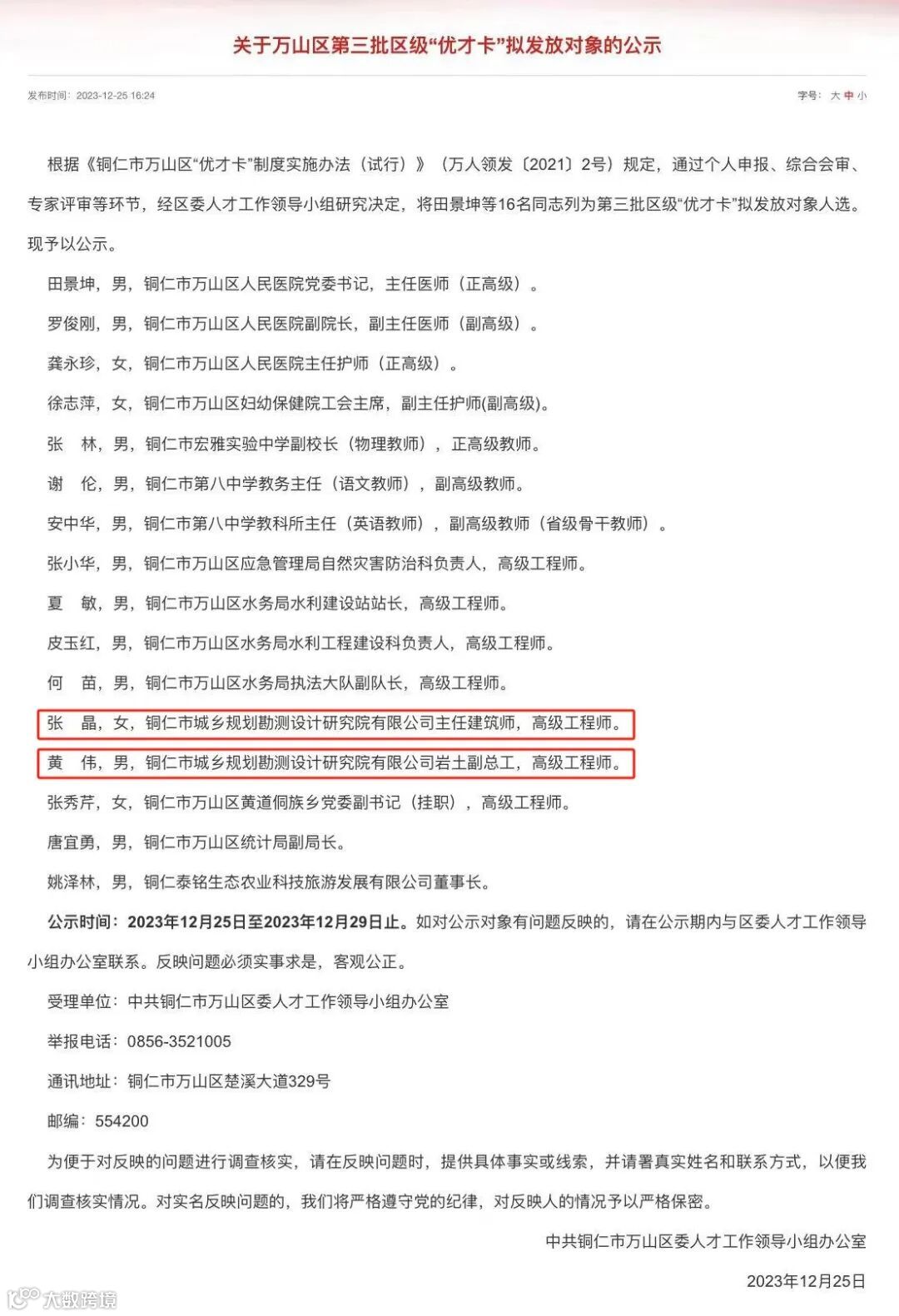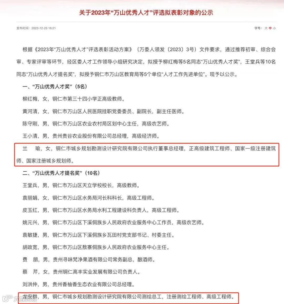 我司获万山区“人才工作先进单位”。我司执行董事、总经理兰瑜获“万山区优秀人才奖”,测绘总工龙安群获“万山优秀人才提名奖”。我司主任建筑师张晶、岩土副总工黄伟获万山区第三批区级“优才卡”拟发放对象。