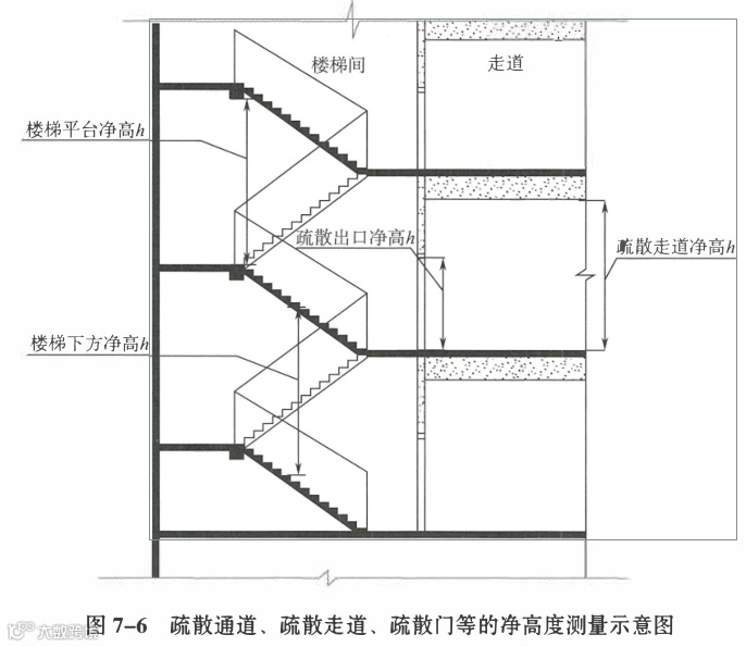 3、疏散出口,根据《指南》:出口处门口的净高度,即门框至地面的净高度。如图四所示(《指南图7-6》),即连接疏散走道与楼梯间或前室的门(开敞楼梯间时指楼梯间处),或直接至室外安全区域处。