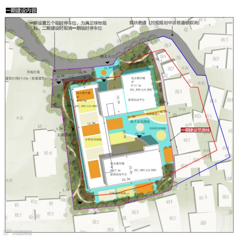 现有用地为4925㎡,在上位规划中,用地向东扩大2020㎡,扩大后的用地为6945㎡,北侧道路取消,东侧则规划了一条城市次干道。如何在现状用地上解决当下教学需求,同时又能贴合上位规划的总体布局,适应城市后期发展进程,避免土地及建设成本的浪费,是本案在建设时序中主要思考的问题。