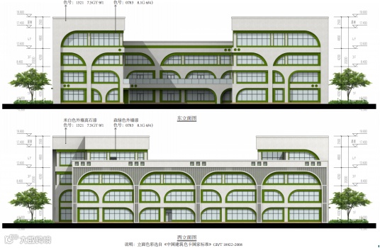 一期建设内容为综合教学楼,主入口设置在北侧道路方向,在建筑一层楼位置设置临时的晨检大厅。待东侧规划的城市次干道修建完成后进行二期建设,修建独立门厅,主入口随之调整至东侧,完善园区整体形象,衔接城市发展建设需求。