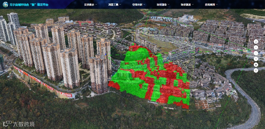 空间分析主要通过空间数据和空间模型的联合分析来挖掘出空间目标的潜在信息。其中距离、方位、拓扑关系组成了空间目标的空间关系,可以作为数据组织、查询、分析和推理的基础。系统主要实现了视域分析、日照分析及淹没分析等功能。以视域分析为例,主要实现原理为:点击事件-鼠标移动事件,显示创建一个格网以及锥体,对相机视野中的空间区域做阴影贴图,最后做属性绑定。视域分析效果如下图: