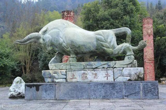 进入景区,图腾广场内矗立镇园之宝——土家玉牛,玉牛由一整块岫岩玉精雕而成,长5米,高2.3米,重达12吨,堪称“亚洲第一玉牛”,土家人自古崇拜牛,这头雕塑也取名为“土家玉牛”,代表着土家人的勤劳善良和财富,也象征了一种勇敢无畏的精神。