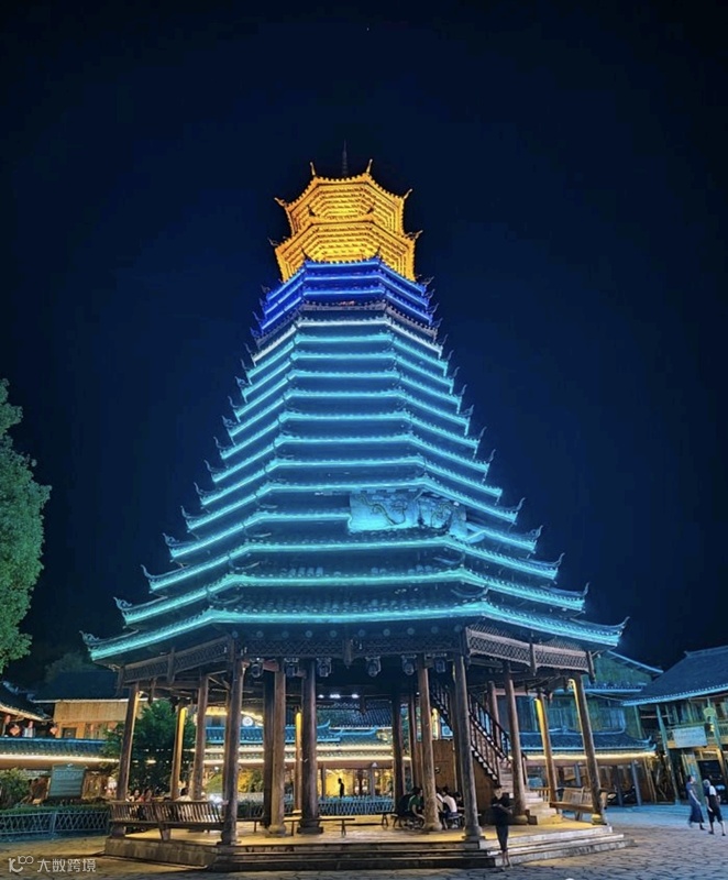 寨子中央是一个圆形的广场,广场一角矗立着一座侗寨的标志性建筑--鼓楼,鼓楼以杉木 凿榫衔接,顶梁柱拨地凌空,排枋纵横交错,上下吻合,采用杠杆原理,层层支撑而上,鼓楼通体木质结构,不用一钉一铆,结构严密坚固,数百年不朽不斜,大梁柱、照面坊,由族中长辈年高具有威望的老人选定,木材优良、粗大,高度均匀树龄古老,方可作为鼓楼建造用材。