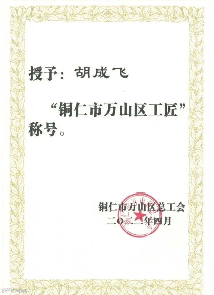 恭喜我司胡成飞获“铜仁市万山区工匠”荣誉称号