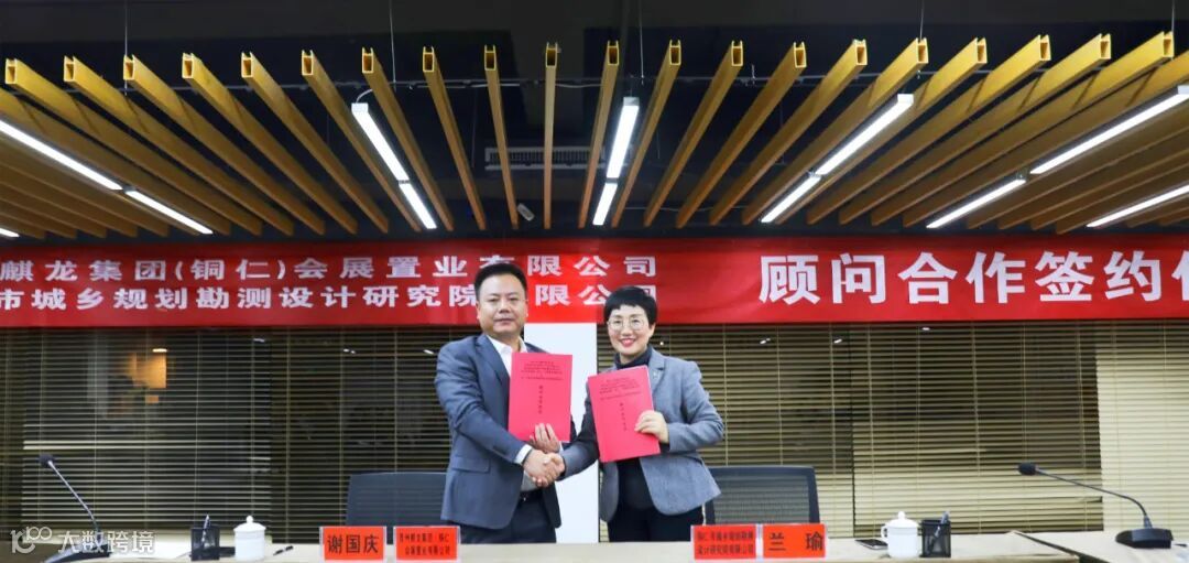 2021年11月15日,贵州麒龙集团(铜仁)会展置业有限公司与铜仁市城乡规划勘测设计研究院有限公司举行顾问合作签约仪式。贵州麒龙集团(铜仁)会展置业有限公司总经理谢国庆与我司执行董事、总经理兰瑜出席并签约,乾麟龙集团铜仁龙玺项目负责人冯雄,麒龙集团铜仁公司开发负责人杨燕、我司副总经理谭化民,副总经理付秀兰等相关人员参加会议。