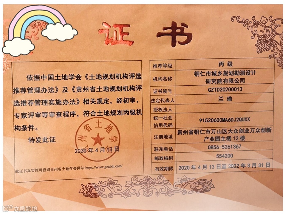 依据中国土地学会《土地规划机构评选推荐管理办法》及《贵州省土地规划机构评选推荐管理实施办法》经评审认定和公示等程序,我院成功取得土地规划丙级资质。今后将可承接土地利用总体规划、土地开发整理规划、耕地保护规划、土地生态建设规划、土地整治工程规划以及其他土地专项规划编制、设计、论证、咨询等业务。