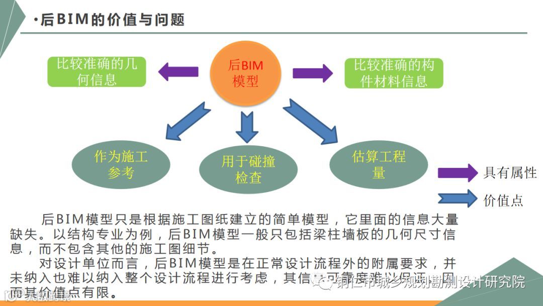 BIM使用现状:一是在正常CAD设计流程之外,专门再由BIM团队根据施工图建立一个三维的BIM模型。这种方式,一般称为后BIM(翻模),主要目的在于合规,同时也能进行管道综合;二是直接在BIM软件上进行BIM正向设计,此种方式处于探索阶段。