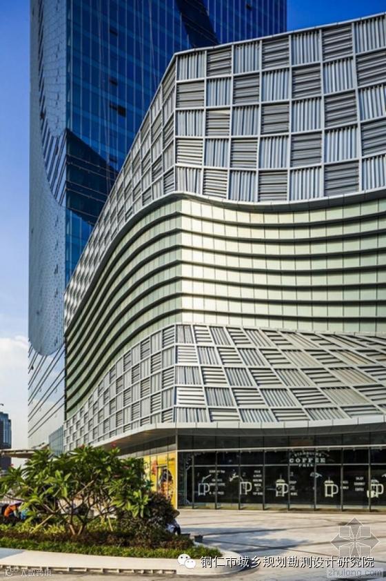 购物中心的经营业态属于时尚精品, 中标方案力求从时尚元素—--高级皮具的表皮设计手法中吸取灵感, 仅采用横竖条纹的变化,材质十分单纯, 但在光影下产生出丰富的肌理效果。 飘带的加入打破了立面的方整, 并在两侧的主入口处产生强烈的扭转,与其两边相对比较平整的立面产生对比, 由此从视觉上突出了主入口,其扭转产生的挑出形态同时替代了雨篷的功能,翻滚的彩色飘带极大丰富了购物中心的商业气氛。