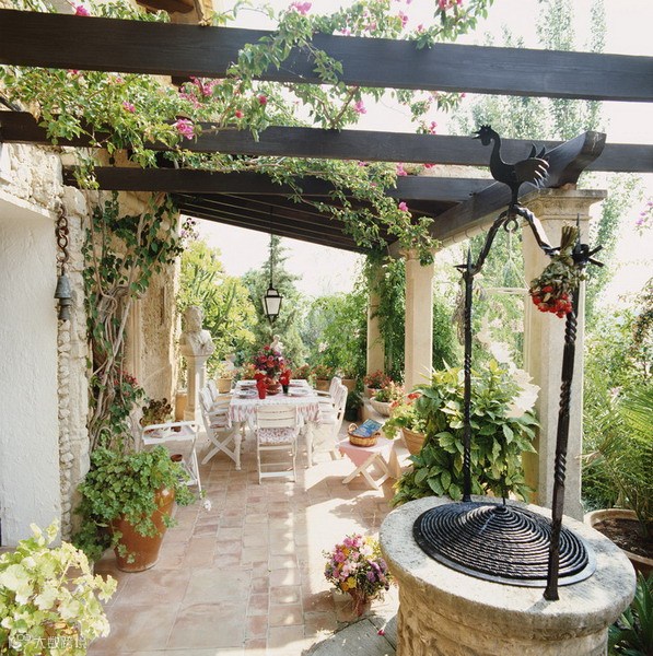 建筑:让花园与建筑相匹配。重复使用相同的主题、外形、颜色、式样及建筑材料,通过使用院子、平台、乔木、阳台、围栏及其它东西将建筑融入花园。