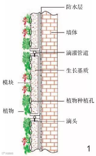 传统技术由植物和平面种植基盘构成,如地栽攀爬类植物,利用建筑种植槽栽植下垂植物,或通过摆放花盆实现立面绿化,其效果形成依赖植物攀爬特性;新型植物墙技术则是一套完整的绿化体系,由支撑系统、灌溉系统、栽培介质系统、植物材料等共同组成一个轻质栽培系统。技术的创新使植物的选择面更广,创造了丰富的绿化效果,扩宽了垂直绿化的应用范围。