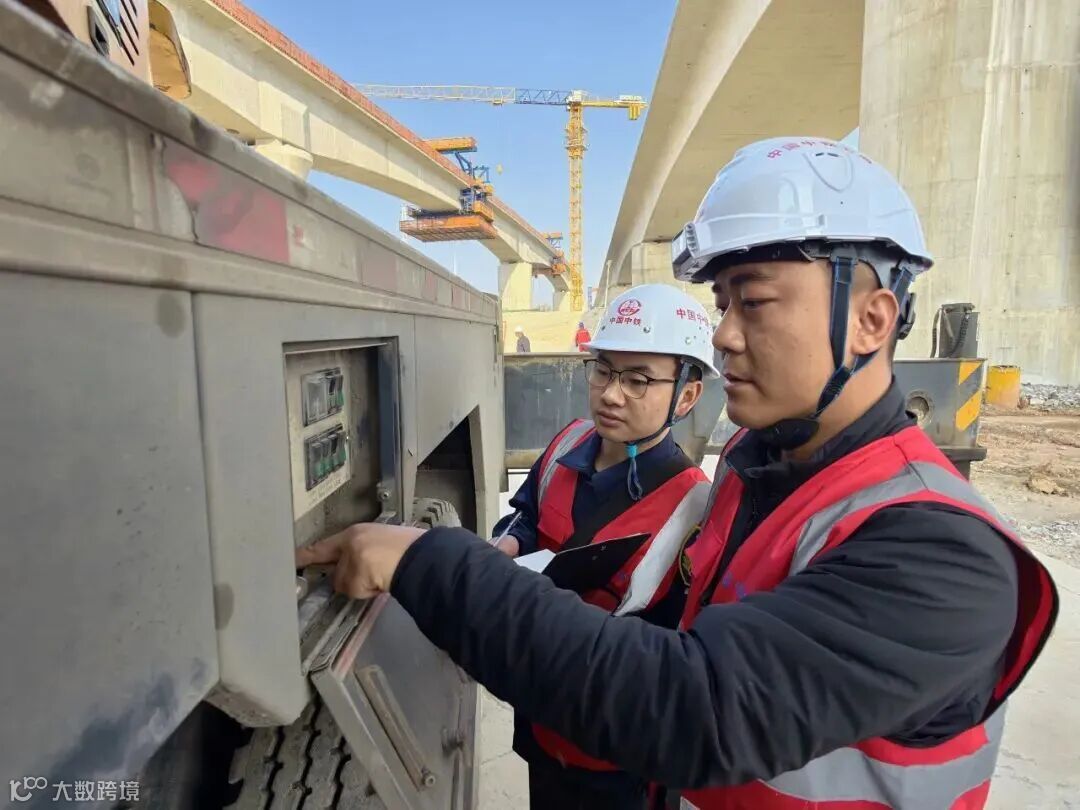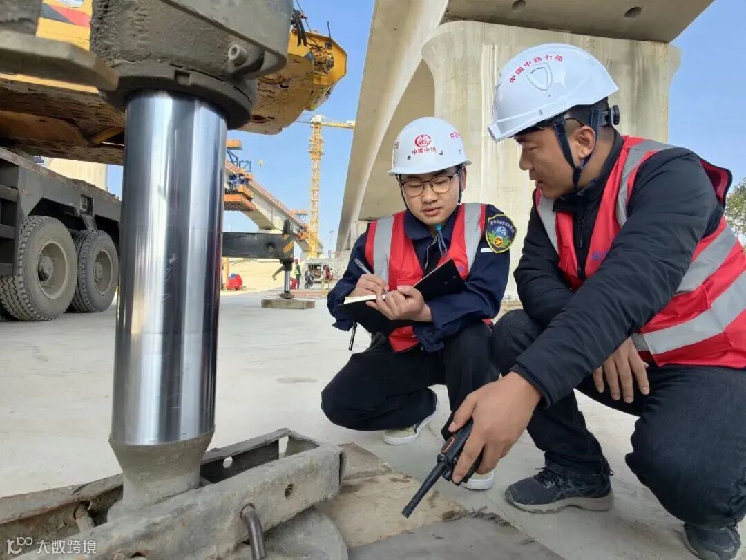 太阳逐渐升高,师徒俩爬上了23#墩桥面。如果说刚才看大型机械是粗中有细,那在桥面上,就是纯粹的“针尖对麦芒”。刚上桥,老张第一件事就是直奔灭火器。他一把拎起梁面上的灭火器,熟练地查看压力表指针是否在绿区,小戚则在旁边对照着台账核对检查日期。