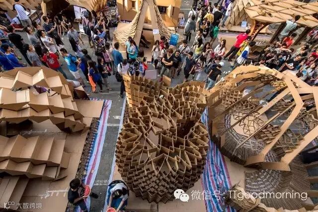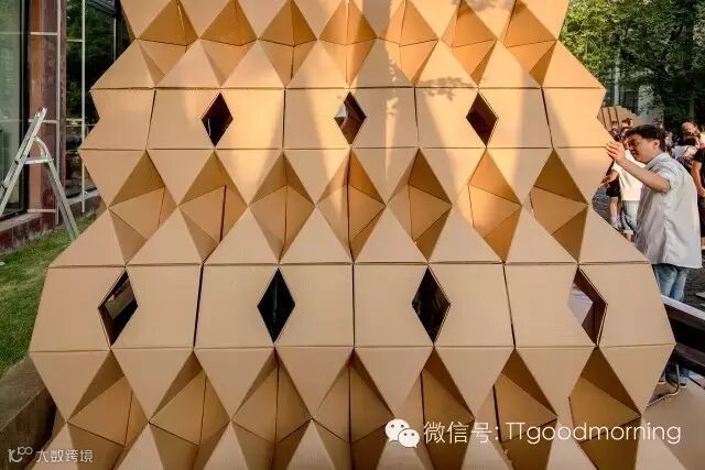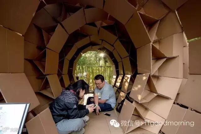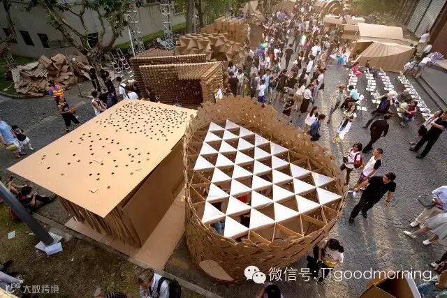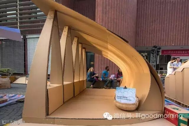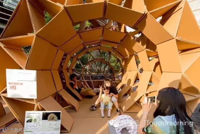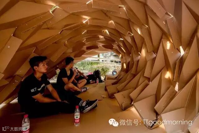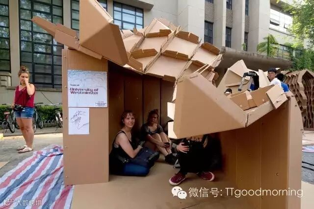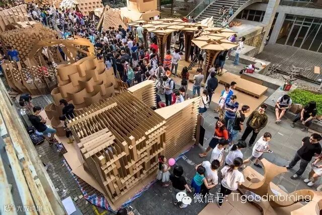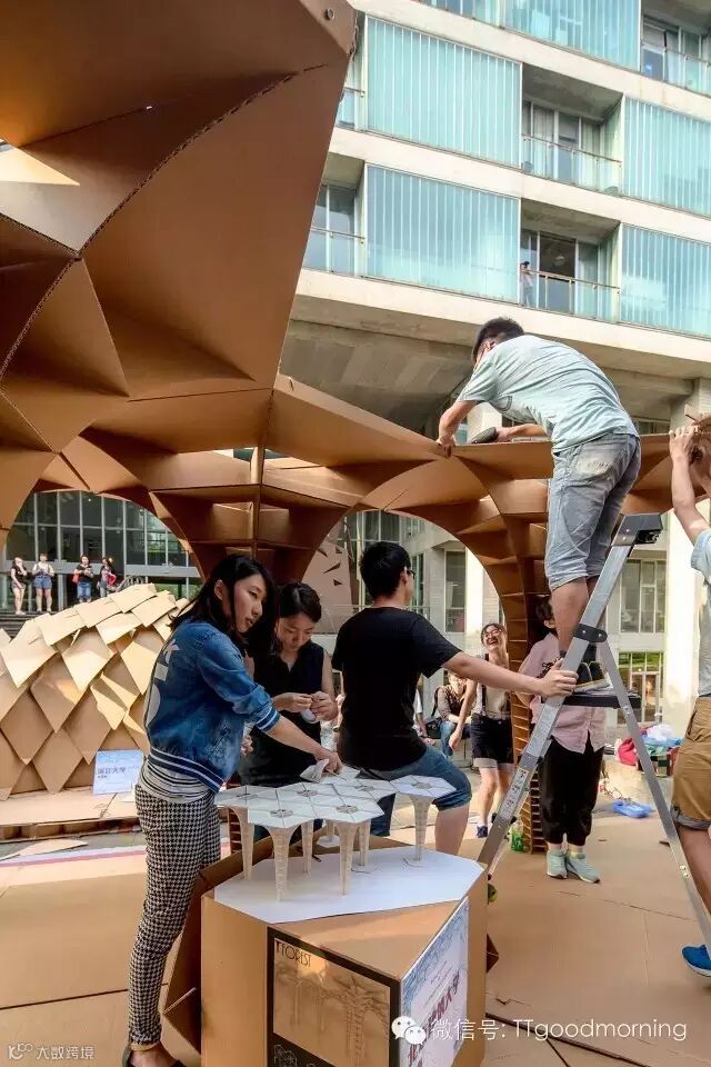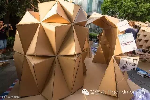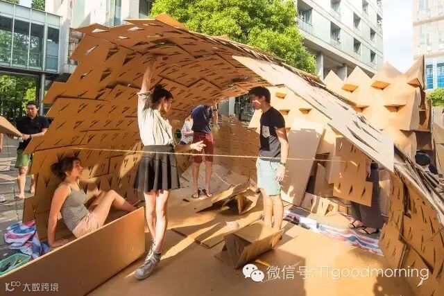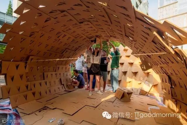 这是一个充满挑战而又激发热情的建筑设计竞赛。每组在规定的时间里,用40张瓦楞纸板,400个螺栓,200米麻绳和5卷胶带,需要通过对于材料性能的认识,发挥想象力,建造出有内部使用空间的纸板建筑。