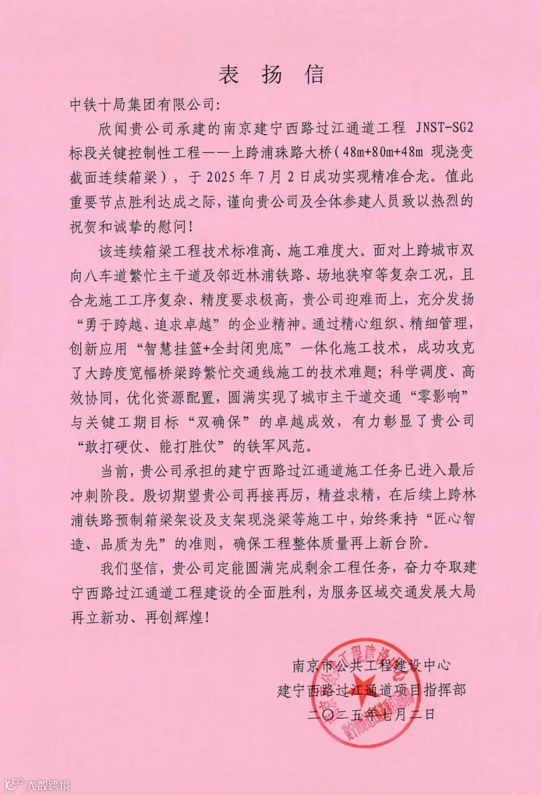 7月2日,南京建宁西路过江通道上跨浦珠中路悬浇梁顺利合龙,并喜获业主表扬信。