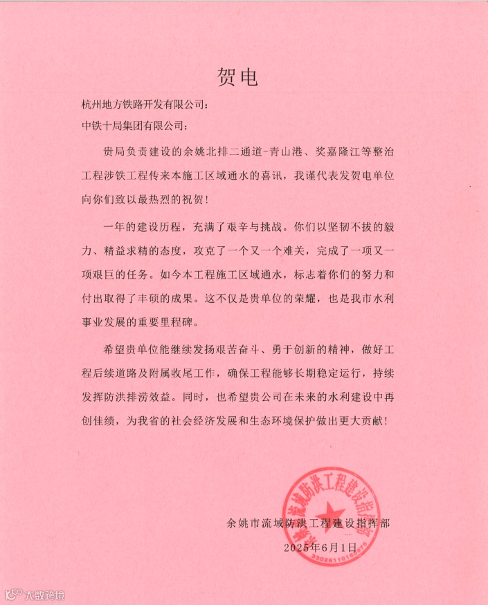 近日,由公司承建的余姚北排二通道—青山港、奖嘉隆江等整治工程涉铁工程圆满实现通水目标,余姚市流域防洪工程建设指挥部发来贺电。