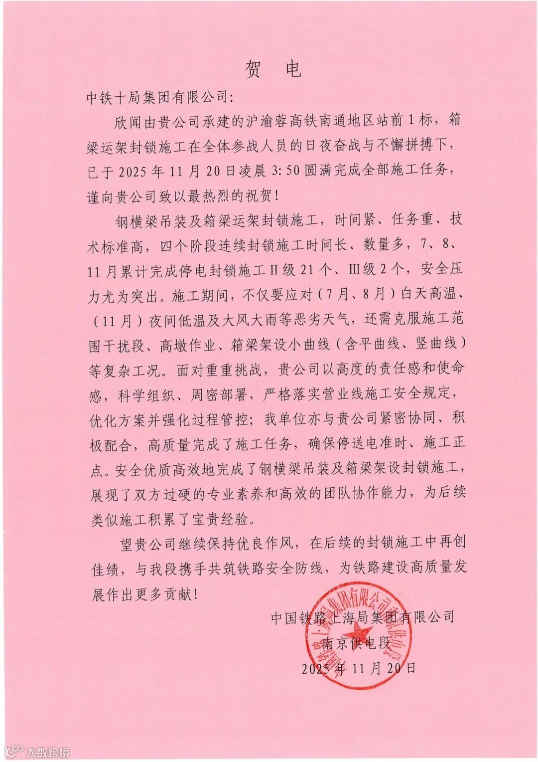 自项目开工以来,项目团队科学制定施工方案,精准把控关键环节,严格落实安全责任,通过网格化、穿透式管理,保障箱梁搬运、架设安全平稳有序。项目部提前组织架梁模拟演练,对施工全过程进行工序写实,优化作业流程,紧密衔接各环节,实现工序流畅转换。施工期间,项目安全完成上跨营业线Ⅱ级封锁施工11次、Ⅲ级封锁施工5次,专业高效的施工能力获得各方的高度认可,累计收到贺电、表扬信6封。