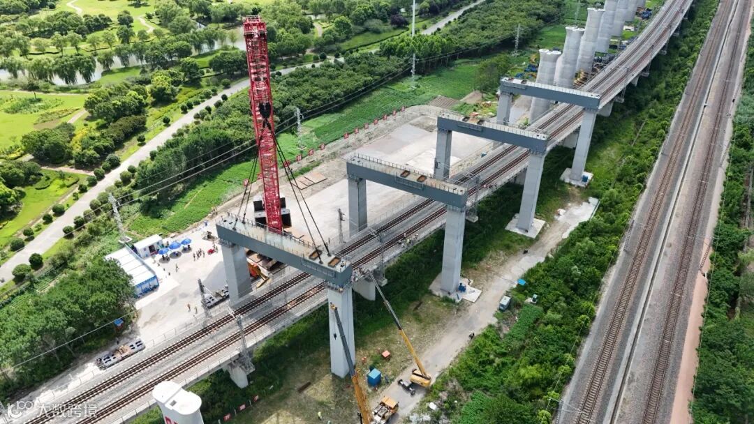 面对邻近营业线施工、大坡度小曲线复合工况、特殊门式墩架梁及踩双架单等一系列技术与安全挑战,项目团队综合施策、精准攻坚,逐项突破难题。在1300米小曲线半径和24.5‰大坡度上坡架梁中,充分运用运梁车自动驾驶系统,实时监测路况并自动调整行驶参数,有效保障了运梁过程的平稳性与连续性。在跨盐通高铁特大桥实施“踩双架单”施工期间,创新采用可重复利用的支承立柱,对双线箱梁进行加固支承,确保支承体系稳固可靠。