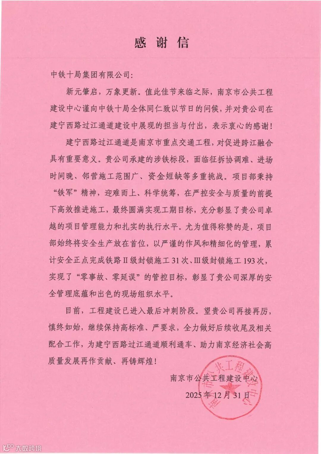 南京市公共工程建设中心发来感谢信
