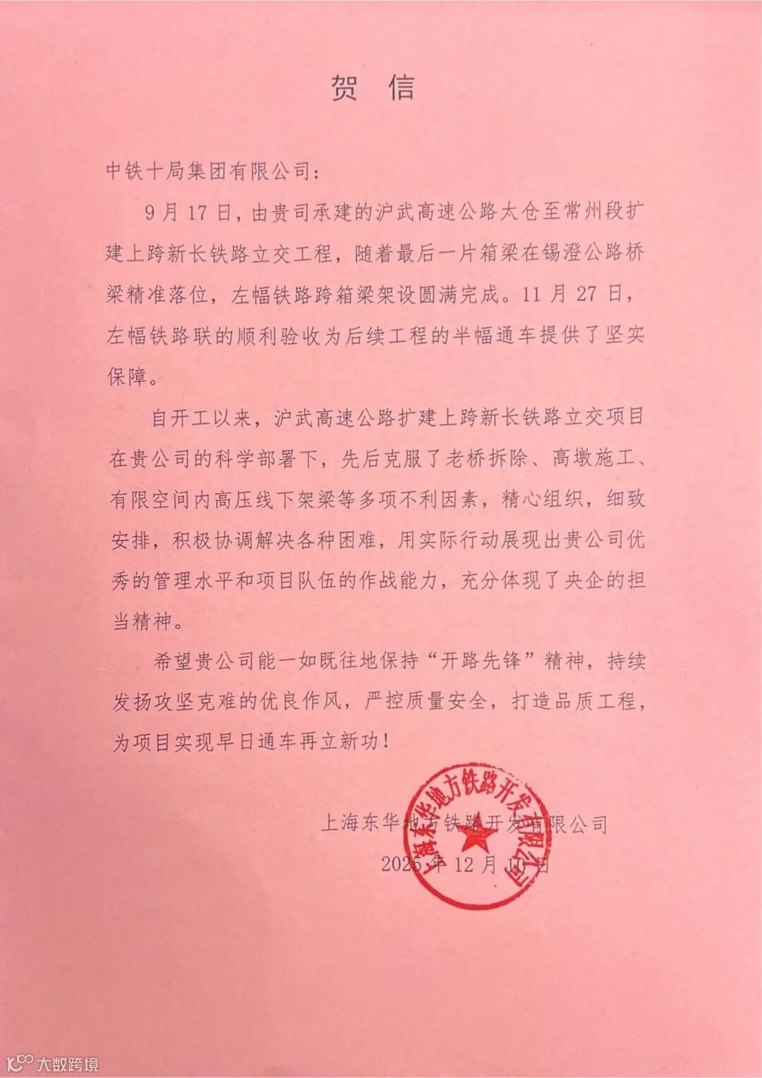 上海东华地方铁路开发有限公司发来贺信