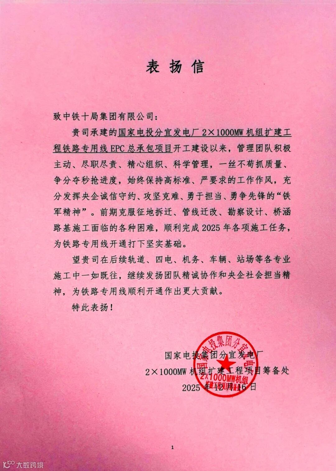国家电投分宜发电厂发来表扬信