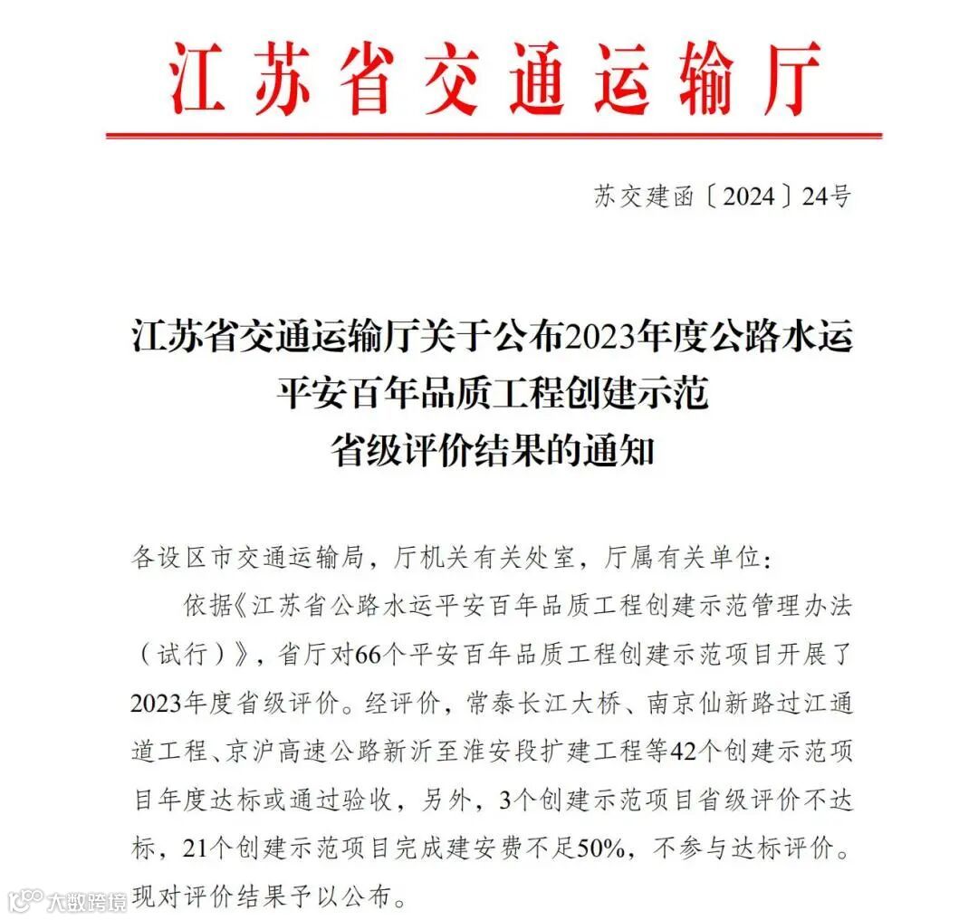 ▲南京建宁西路项目、仪禄高速项目、南京仙新路项目在江苏公路水运平安百年品质工程创建示范中年度评价达标