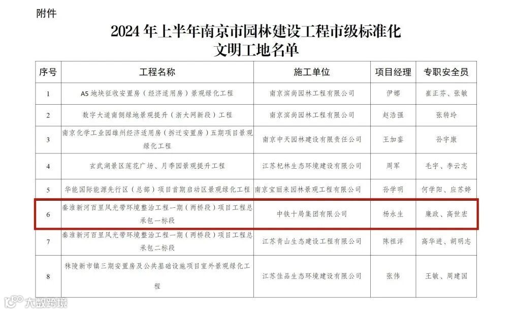 ▲秦淮新河百里风光带环境整治项目荣获2024年上半年南京市园林建设工程市级标准化文明工地