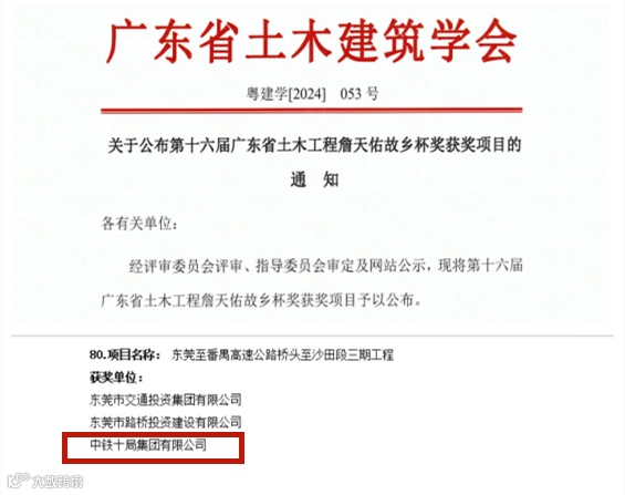 ▲莞番高速项目荣获广东省土木工程“詹天佑故乡杯”