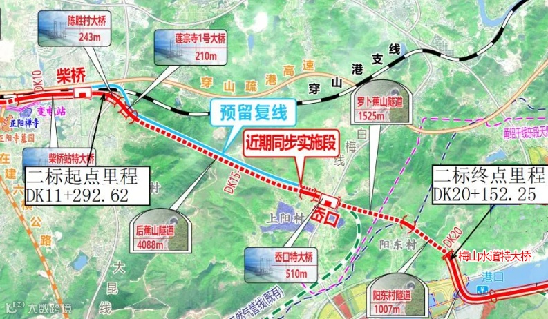梅山铁路专用线位于宁波市北仑区,总投资62.69亿元,是梅山港对外集疏运和临港产业对外货运交流的铁路线路,是推动梅山港多式联运发展、支撑宁波舟山港建设世界一流强港的重要交通基础设施。工程起自既有北仑支线大碶站,终至梅山港站,正线长度25.535公里,设站4座,均在宁波市北仑区境内,为宁波枢纽的货运铁路线。
