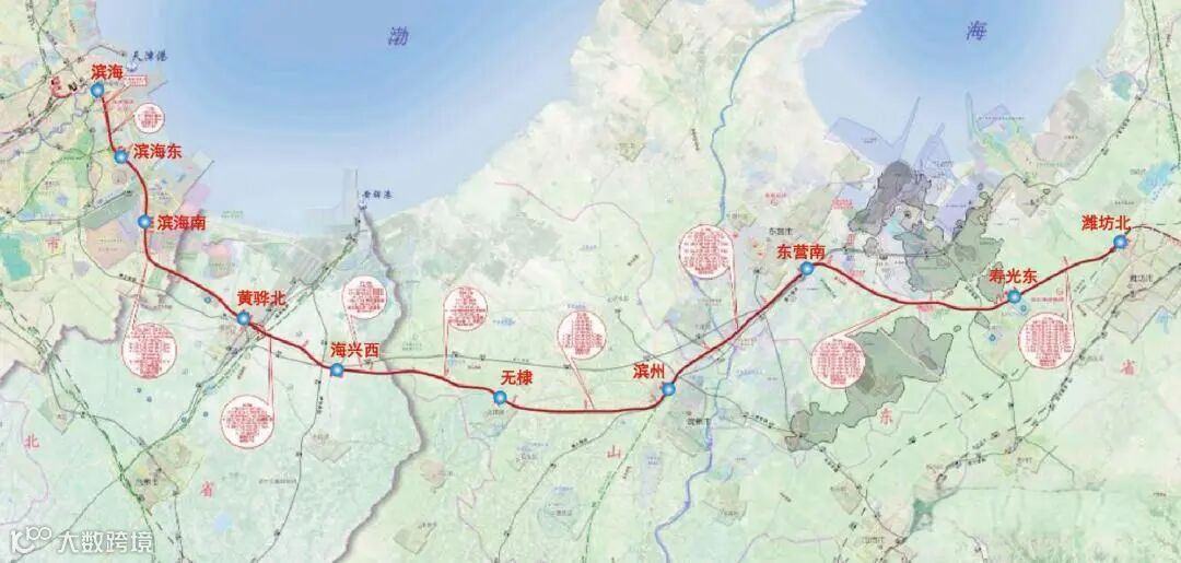 新建津潍高铁北起天津滨海站,南至潍坊北站,全长348.3公里,双线高速铁路,设计速度350公里/小时,是国家“八纵八横”高铁骨架的重要组成,也是京沪辅助通道和沿海通道的共同组成部分,是进一步落实京津冀协同发展、长江经济带发展等国家战略、完善京沪通道综合交通运输体系的重点工程。项目建成通车后将优化升级天津市与山东半岛、长三角区域的交通联系,进一步支撑和引领京津冀协同发展,在推进区域资源共享、实现区域协调发展等方面发挥重大作用。