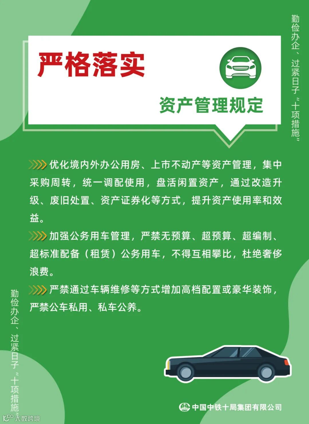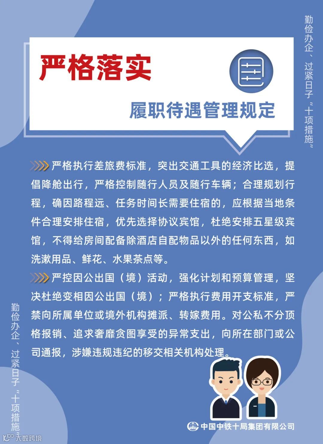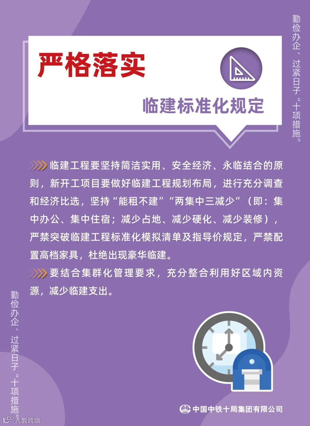 为认真贯彻党中央、国资委党委关于勤俭办企、过紧日子的决策部署,落实中国中铁《“艰苦奋斗、从严从紧预算管理‘八项规范’”》的要求,引领广大员工立足岗位、艰苦奋斗,持续提升价值创造能力,推动企业高质量发展,特制定印发“勤俭办企、过紧日子‘十项措施’”。“十项措施”都有哪些内容,具体要求是什么,快跟随小铁匠一起学习践行吧!