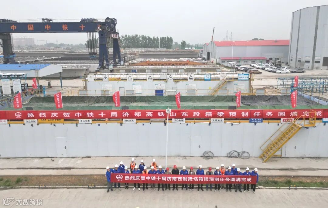2023年5月7日,济郑高铁最后一榀箱梁在中铁十局济郑高铁山东段站前I标施工现场顺利完成。