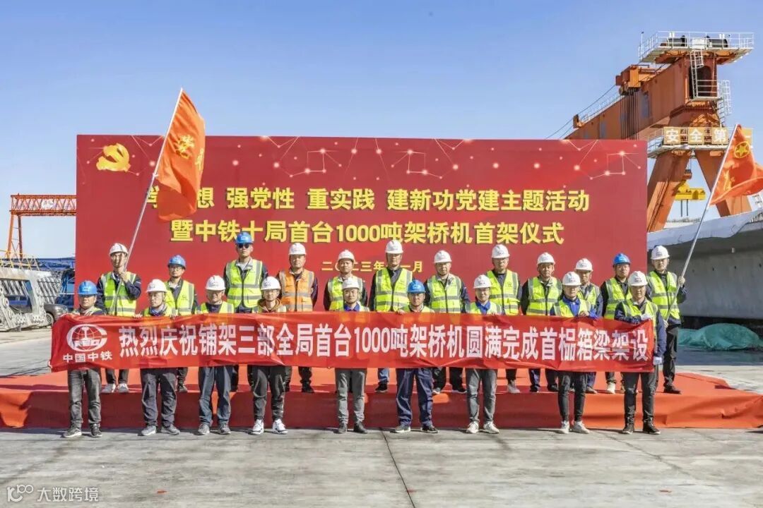 架梁现场,公司党委开展了“学思想 强党性 重实践 建新功”党建主题活动暨中铁十局首台1000吨架桥机首架仪式。雄商高铁站前12标项目部所属干部职工100余人,参与了本次活动。