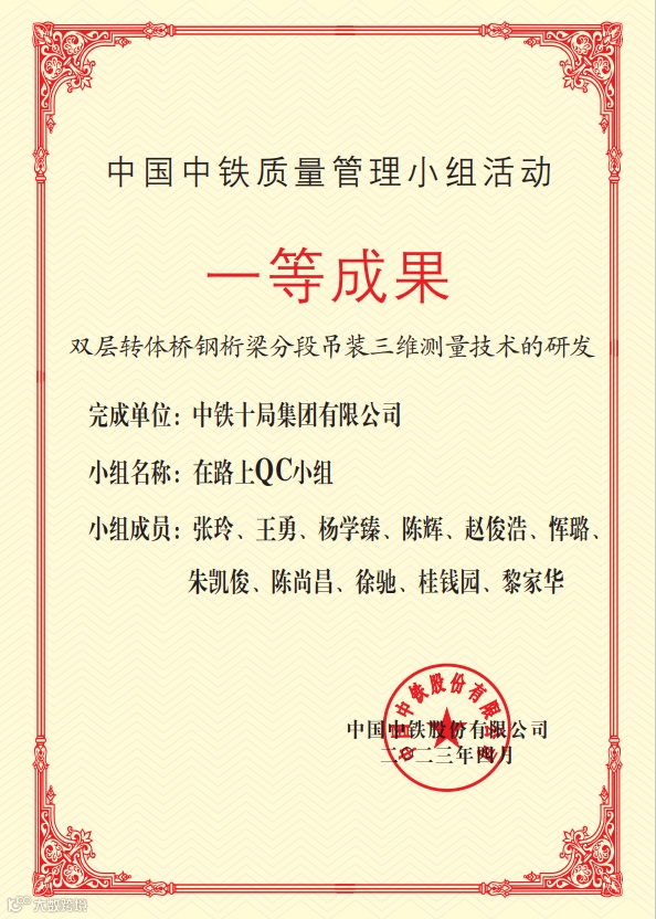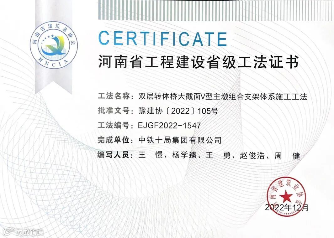 为解决施工遇到的各项难题,公司邀请广铁集团、中铁第四勘察设计院、石家庄铁道大学、长安大学有关单位开展“跨营运铁路连续钢桁腹—板桁组合双层桥建造技术”课题研究。截至目前已上报专利16项,其中国家发明专利9项、实用新型专利7项;获得软件著作权1项;获得企业级工法4项,其中2项获得河南省级工法,2项获得济南市工法;《双层转体桥钢桁梁分节段吊装三维测量技术的研发》荣获中国中铁QC成果“一等奖”、江苏省市政工程建设质量管理小组“二等奖”。