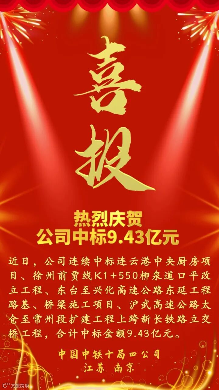 近日,公司经营战线捷报频传,先后中标连云港中央厨房项目总承包(EPC)、徐州前贾线K1+550柳泉道口平改立工程、东台至兴化高速公路东延工程路基、桥梁施工DXDY-DT3标、沪武高速公路太仓至常州段扩建工程上跨新长铁路立交桥工程,合计中标金额9.43亿元,实现了在连云港、盐城、徐州地方市场以及上海东华地方铁路开发有限公司本部市场的新突破!