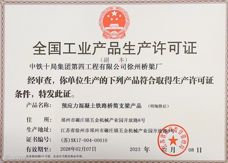 徐州桥梁厂作为四公司桥梁产业的源头,先后分离出的临沂制梁场、南京制梁场、济南制梁场、中卫制梁场等数个分场和后期建设的共计40多个梁场均一次性通过国家生产许可证审查。其中多家梁场受到各铁路局、铁路公司和业主单位的褒奖与好评。
