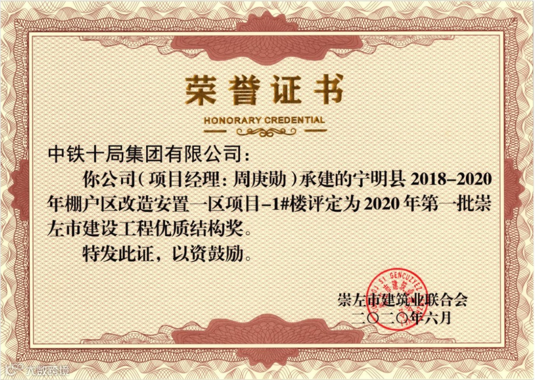 10月15日,广西宁明项目部收到了崇左市建筑业联合会发来的荣誉证书,其承建的宁明县2018-2020年棚户区改造安置一区项目被评为2020年第一批崇左市建设工程优质结构奖。