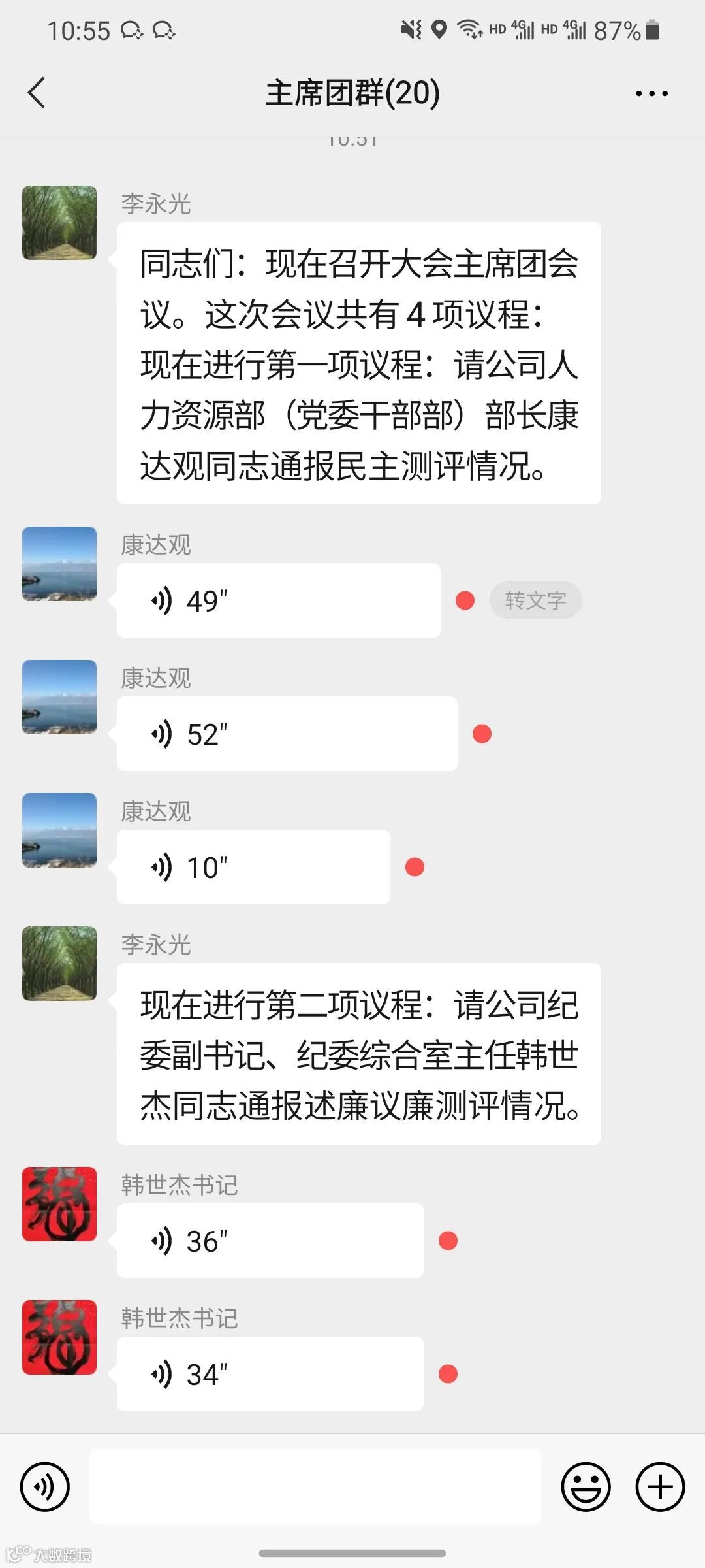 公司工会主席、副总经理李永光同志通过微信群会议的形式召开主席团会议。会议听取了各代表团讨论情况,通报了民主测评、述廉议廉测评、票决情况,审议并通过了大会决议(草案)。