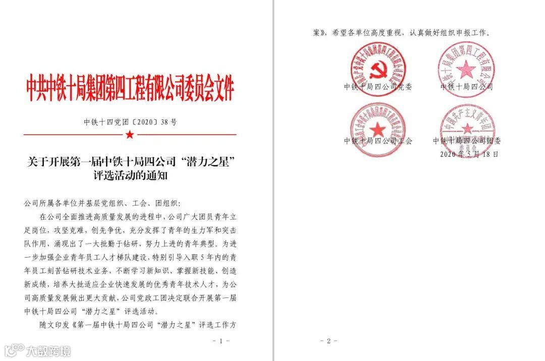 评审领导小组成员根据公示结果,并根据正式候选人得票得分(以第一名票数换算百分制,占比50%)、考察打分(占比25%)、对口部门打分(25%)进行最终评选。综合结果前5名者当选为中铁十局四公司“潜力之星”。