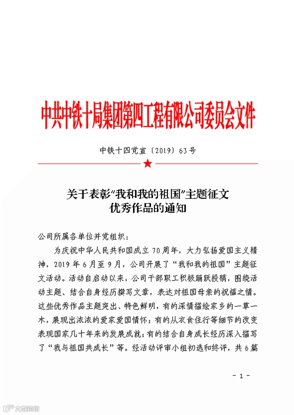 为庆祝中华人民共和国成立70周年,大力弘扬爱国主义精神,公司开展了“我和我的祖国”主题征文活动。活动自启动以来,公司干部职工积极踊跃投稿,围绕活动主题、结合自身经历撰写文章,表达对祖国母亲的祝福之情。