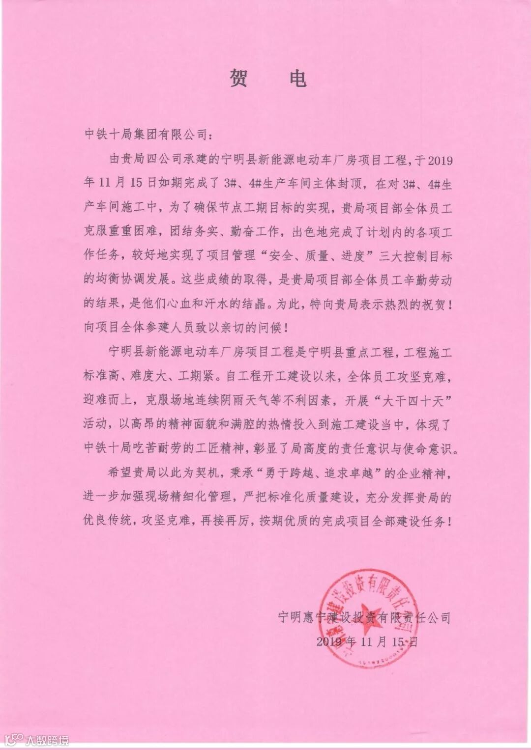 公司宁马项目部喜获业主贺电