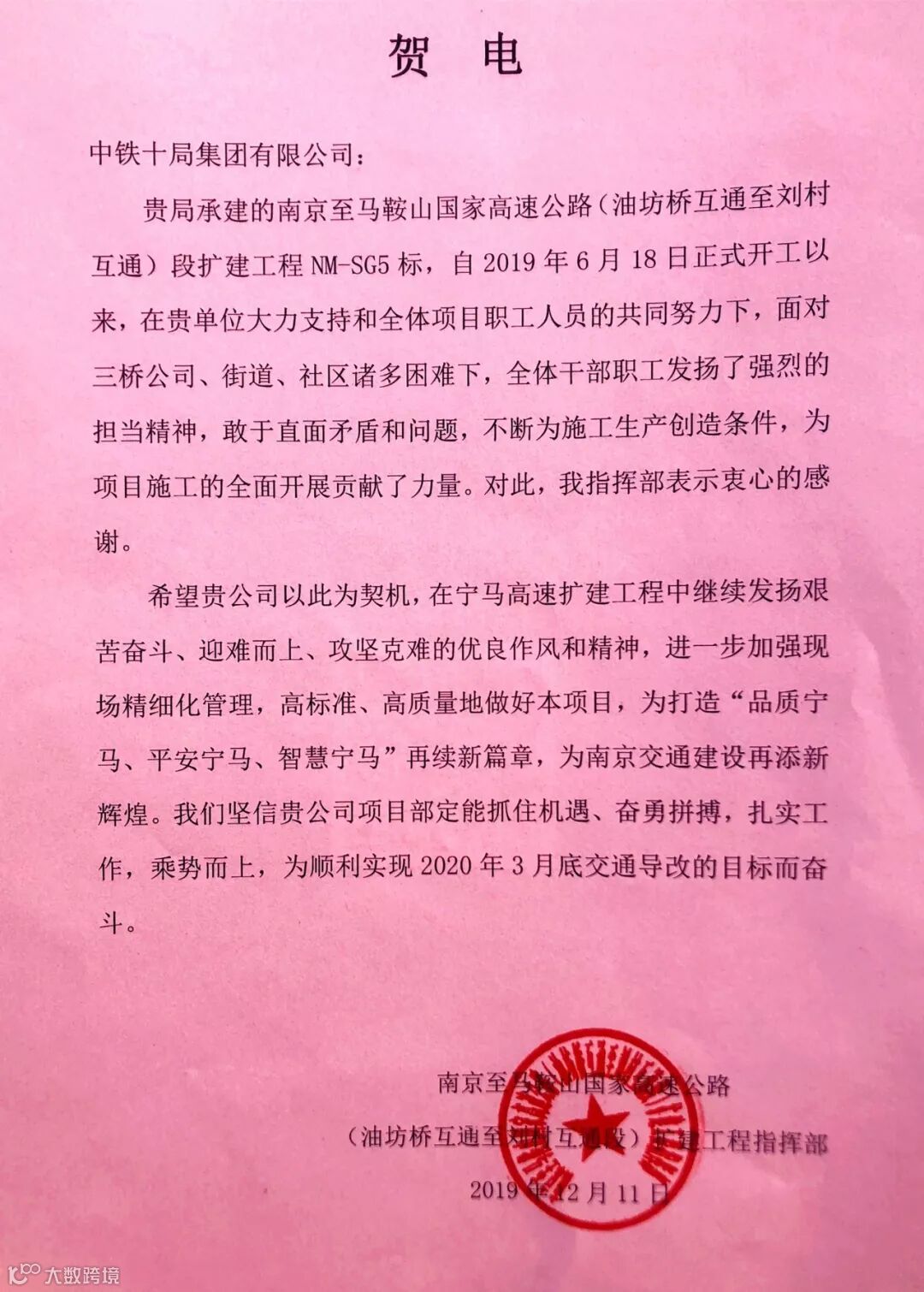 公司宁明项目部喜获宁明县人民政府和业主贺电