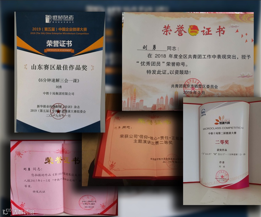 在工作之余他主动参加公司组织的各项活动,先后获得公司演讲比赛二等奖,摄影作品参展江苏省企业职工书画摄影作品展,获中国企业微课大赛山东赛区最佳作品奖,股份公司微课大赛二等奖,南京市栖霞区优秀共青团员,2017-2019年集团公司优秀通讯员等荣誉称号。
