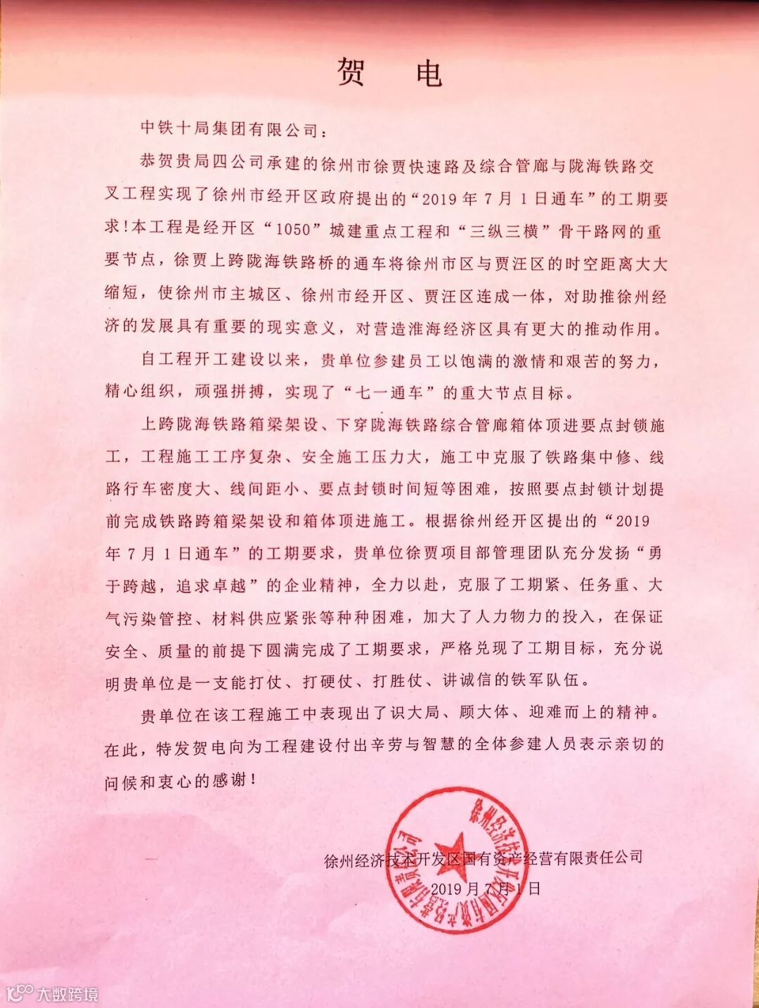 7月1日,公司承建徐州市徐贾快速通道南延工程正式通车。该快速路是连接徐州、贾汪的重要通道,全长约4.2公里(含跨陇海铁路大桥一座),道路红线宽度为53米,双向6车道。随着本项目的通车,该道路和彭祖大道、昆仑大道、高新路等形成了高铁商务区的主干路网。徐州市区与贾汪区的距离大大缩短,徐州市主城区、徐州经开区、贾汪区正式连成一体。同时,也为徐州做大做强淮海经济区中心城市增添了新动力。