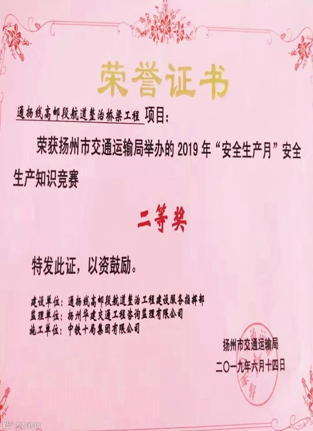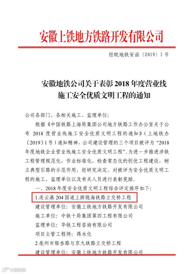 公司连云港204项目部荣获安徽地铁公司2018年度营业线施工安全优质文明工程称号
