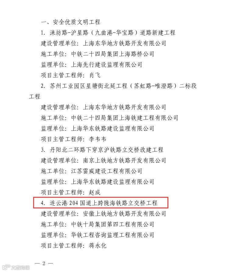 公司两项工程喜获中国铁路上海局“安全优质文明工程”称号