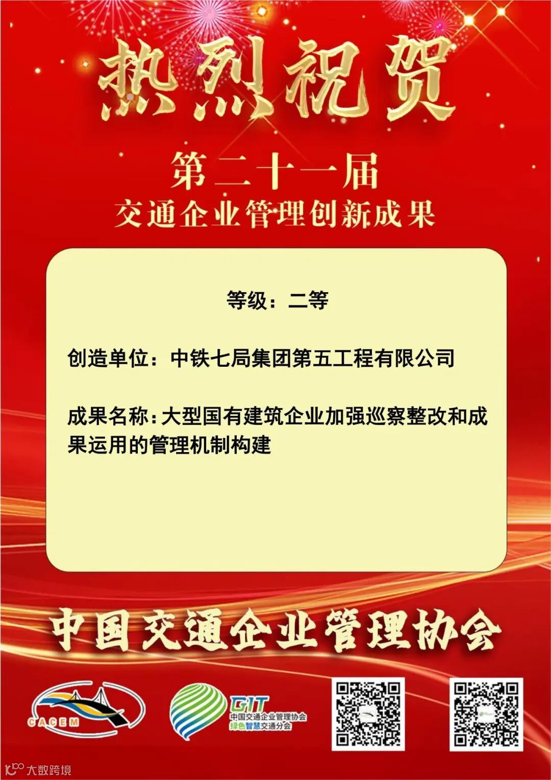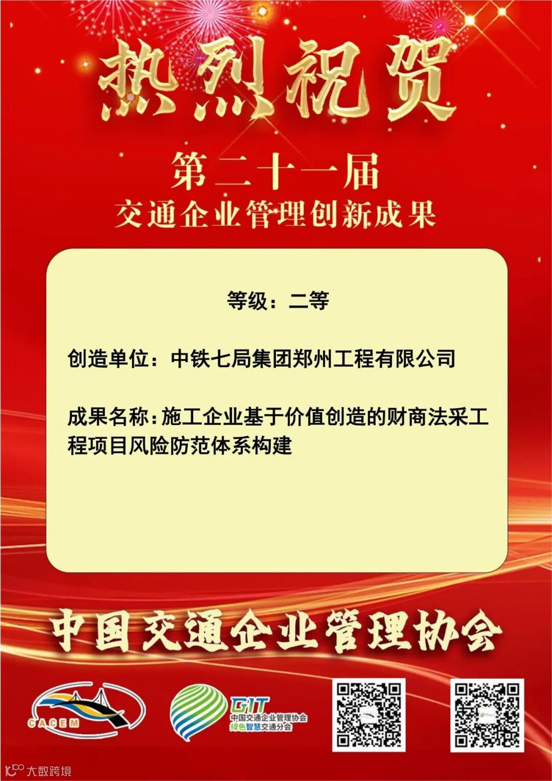 近日,从中国交通企业管理协会获悉,中铁七局申报的《大型国有建筑企业加强巡查整改和成果运用的管理机制构建》和《施工企业基于价值创造的财商法采工程项目风险防范体系构建》两项成果,荣获第二十一届交通企业管理创新成果二等奖。