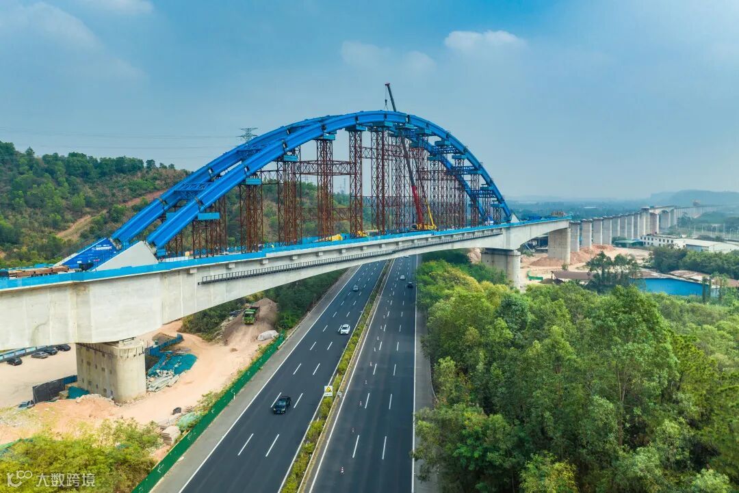珠肇高铁跨广明高速公路180米跨度连续梁拱桥成功合龙。