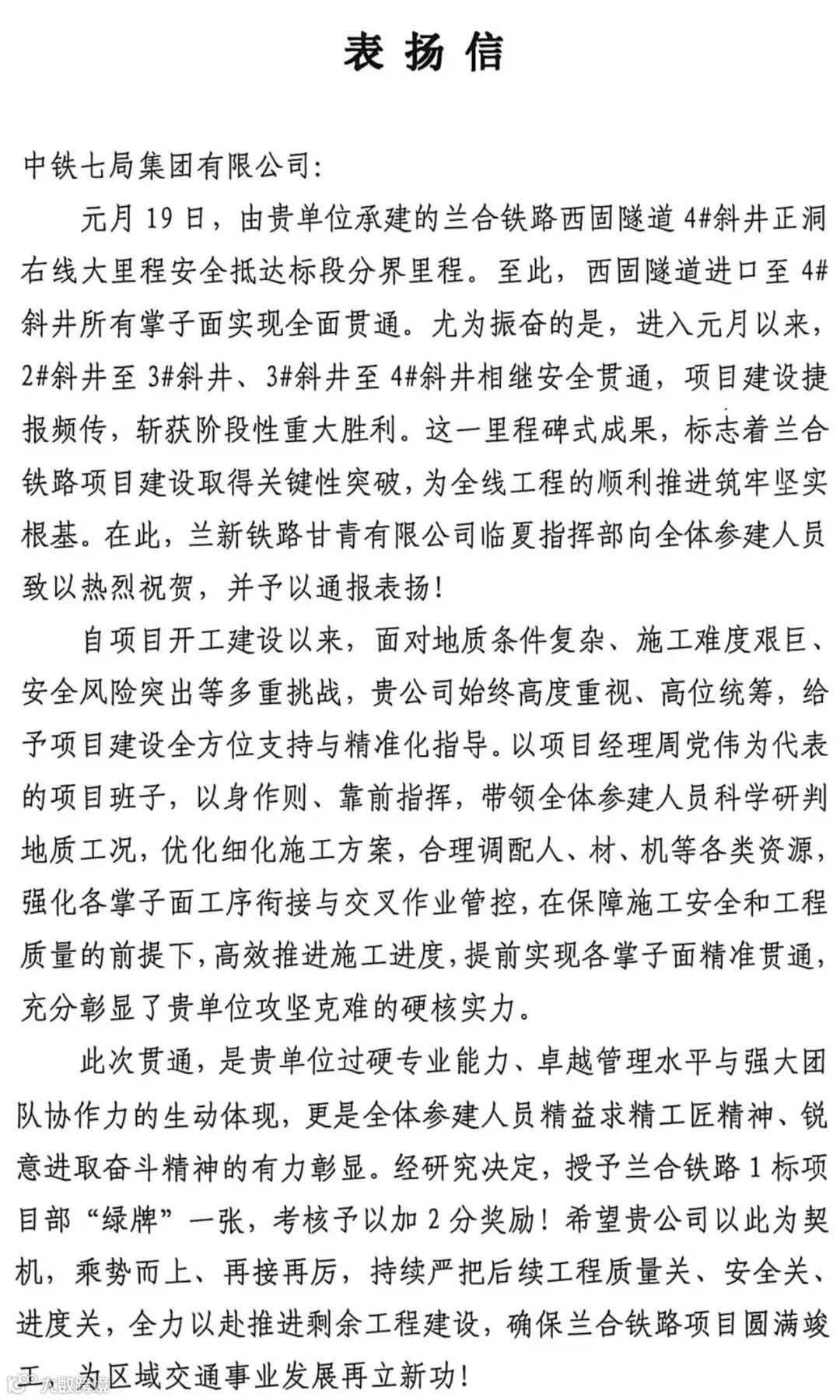 1月19日,兰新铁路甘青有限公司临夏指挥部向中铁七局兰合铁路1标项目部发来表扬信,热烈祝贺项目部顺利实现西固隧道4#斜井正洞右线大里程抵达标段分界里程的目标,高度赞誉企业坚守履约承诺的责任担当与攻坚克难的施工实力。此次关键节点的顺利达成,不仅较指导性施组工期提前150余天,更获得业主授予的“绿牌”表彰及考核加2分的嘉奖。